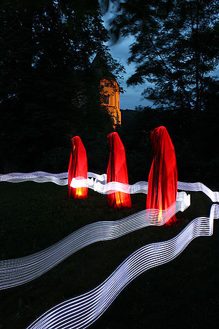 English: The Time Guards. With his timeless installations “guards of time“, the thoughtful and versatile media and light artist Manfred Kielnhofer shows that since the beginning of time mankind has had protectors, both for historic and mystical reasons. It only seems that man himself is a potential source of danger for his own existence. In his works of art Kielnhofer deals with and looks into the natural human desire for feeling secure. Thus his oeuvre reflects genuine exploration, consideration and discussion of current as well as historic moods and sensibilities of his social environment. His works of art captivate with elaborate combinations of light and different materials.