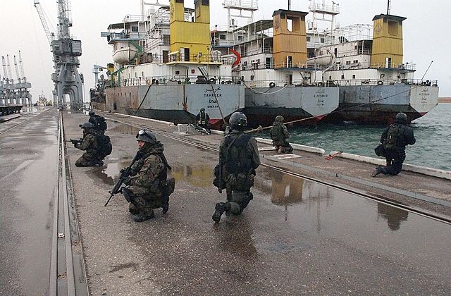- Members of the POLISH Special Operations Forces, Grupa Reagowania Operacyjno Mobilnego-or- (Operational Mobile Response Group) (GROM) secure a section of the port of Umm Qasr, Iraq, during Operation IRAQI FREEDOM. The GROM participated in coalition naval forces efforts to clear southern Iraqi waterways of mines and rogue vessels to make way for the arrival of humanitarian relief shipments.