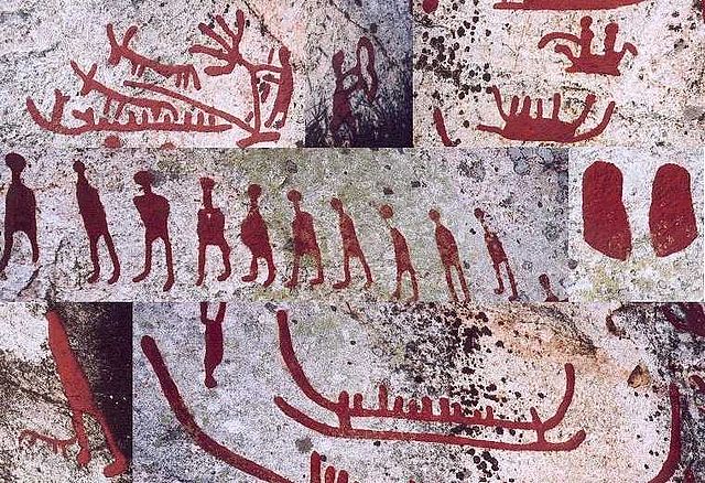 - Rock carvings (petroglyphs) from Scandinavia. Photo Olof Ekström 2003. Also on Swedish wikipedia, uploaded by creator/photographer. The image is a composite showing (top to bottom, left to right): Plowing with oxen (the branch in the farmer's hand is assumed to be part of a fertility ritual), archer/hunter with bow, fishing from a small boat, (middle row) a procession of unknown nature, foot prints, (bottom row) man with dog, typical Scandinavian rock carving ship symbol.