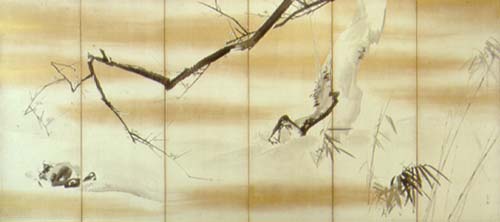 Pine, Bamboo, Plum by Maruyama Ōkyo. One of two six-fold screens. From  here.