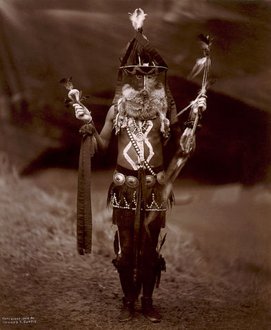 Charlie Day, a European American trader's son, costumed as a God Impersonator, in ceremonial dress including mask and body paint, c.1904