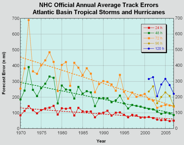 Error on the track since 1970 in Nautical miles. The different lines represent the forecasted position at different times prior to the verification (ex. 36h means the forecast made 36 h before the verification). |