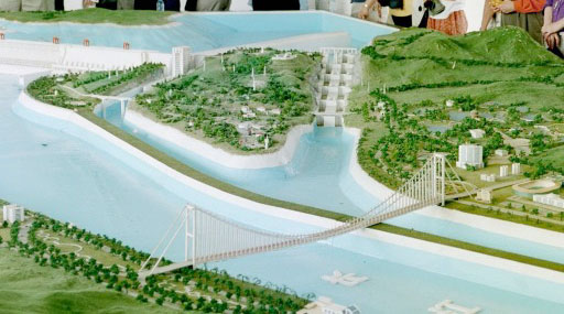 Model of the Three Gorges Dam showing the ship Lift and the double 5 Step Locks. The ship lift is to the right of the dam body with its own designated waterway. The ship locks are to the right (northeast) of the ship lift.