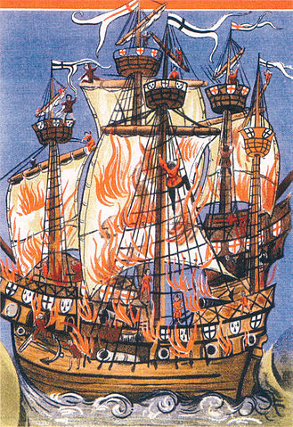 English: The French warship Cordelière and the English warship Regent ablaze at the battle of St. Mathieu on August 10 1512. Illustration for an epic poem in Latin written by the court poet Germain de Brie.