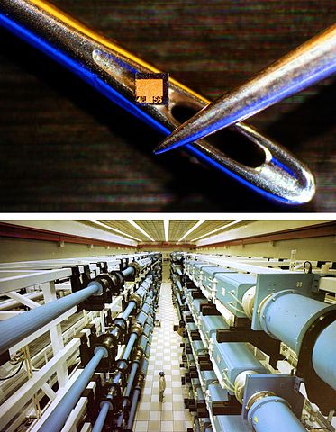 (Composite image formed from [http://en.wikipedia.org/wiki/Image:Laser_diode_chip.jpg] and [http://en.wikipedia.org/wiki/Image:NOVA_laser.jpg] showing huge range of sizes of different lasers. {PD}) |