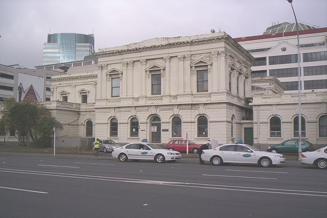 Picture taken by myself, Lewis Holden, of the proposed new Supreme Court - the Old High Court on Whitmore Street in Wellington. The Old Government Building is behind the photographer, and behind the Old High Court (slightly obscured by the picture) is the Wellington District Court (Note the en:Coat of Arms of New Zealand at the top of the building). |