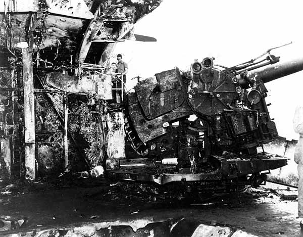 Česky: Zničené 127 mm (5")/38 cal Mk 12 víceúčelové dělo č. 5 ze III. baterie umístěné vzadu na pravoboku USS Enterprise CV-6. Tato baterie byla těžce poškozena druhou pumou, která loď zásahla během bitvy u východních Šalamounů. 38 mužů posádky zahynulo, včetně válečného fotografa Roberta F. Reada. Deset těl nebylo nikdy identifikováno.