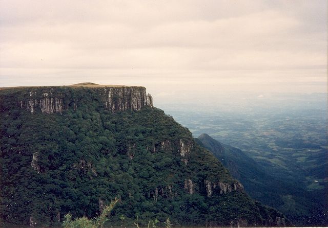 A cliff at the Paraná Flood Basalt. Rio do Rastro, Santa Catarina. One can see the near vertical escarpment of silicic succession from waning-stage of volcanism. |