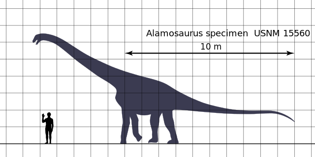 English: A diagram showing the comparitive size of one of the more complete Alamosaurus specimens USNM 15560 compared to a human.