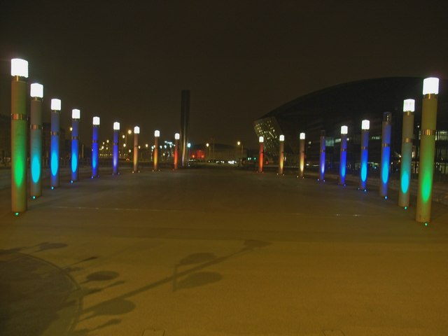 English: Roald Dahl Plas Illuminated columns in Roald Dahl Plas, looking towards the Wales Millennium Centre.