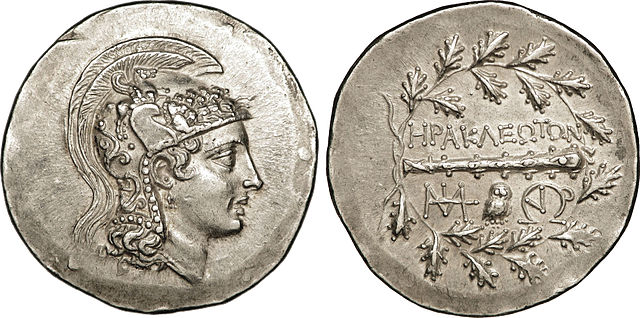 Titulature avers : Anépigraphe. Description avers : Tête casquée d'Athéna à droite, coiffée du casque attique à cimier et à triple aigrette, orné d'un Pégase volant et de quatre protomés de chevaux. Description revers : Massue dans une couronne de chêne ; au-dessous de la massue, petite chouette debout de face et deux monogrammes complexes. Légende revers : HRAKLEWTWN/ (MIAT) - (WUR)  Traduction revers : (d’Héraclée).
