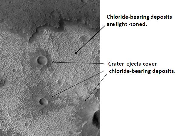 English: Chloride deposits on Mars, as seen by HiRISE. The location is 38.8 degrees south latitude and 221 degrees east longitude. Image was taken by the Mars Reconnaissance Orbiter's HiRISE. The HiRISE camera was built by Ball Aerospace and Technology orporation and is operated by the University of Arizona. Image courtesy NASA/JPL/University of Arizona.