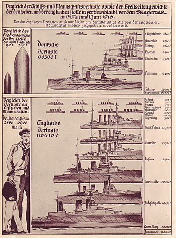 English: 1916 German propaganda postcard, comparing the German and British losses at the Battle of Jutland.