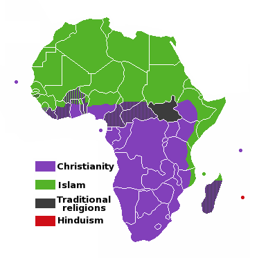 A map of the Africa, showing the major religions distributed as of today. Map shows only the religion as a whole excluding denominations or sects of the religions, and is colored by how the religions are distributed not by main religion of country etc. |