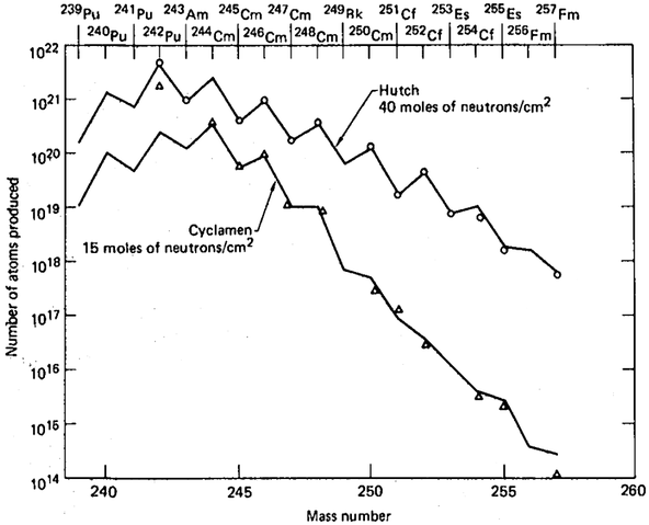 English: Estimated yield of transuranium elements in the US nuclear tests Hutch and Cyclamen