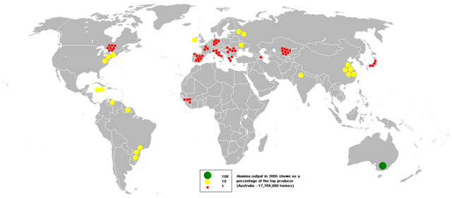 English: This bubble map shows the global distribution of alumina output in 2005 as a percentage of the top producer (Australia - 17,704,000 tonnes).