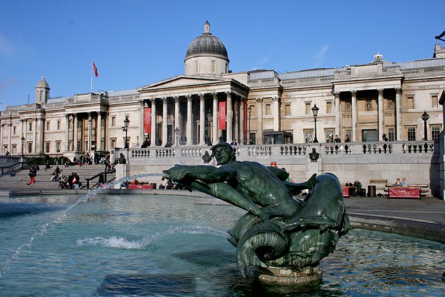 English: Fountain in  Trafalgar Square, with the  National Gallery in the background.