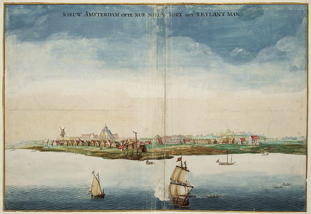 English: Gezicht op Nieuw Amsterdam by Johannes Vingboons (1664), an early picture of Nieuw Amsterdam made in the year when it was conquered by the English under Richard Nicolls.