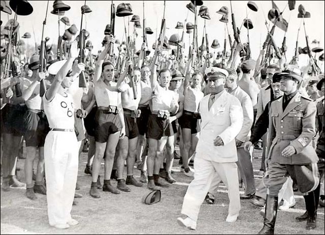 Description Picture of Benito Mussolini and Fascist Blackshirt youth in 1935 in Rome.