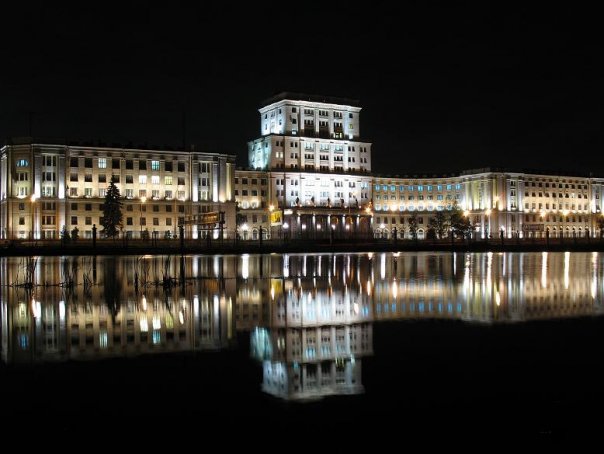 English: MSTU’s main building at night.
