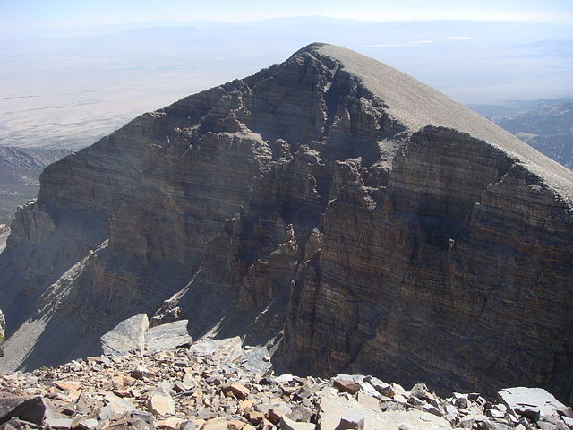 English: Highly durable quartzite of the Prospect Mountain Formation is the primary component of Wheeler Peak, the highest mountain peak entirely within Nevada. This picture is of Jeff Davis peak, from Wheeler Peak.