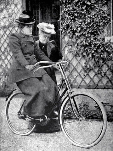 English: Frances E. Willard learning to ride a bicycle. Page 56 of A Wheel Within A Wheel