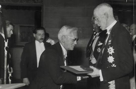 English: Alexander Fleming receives the Nobel Prize from King Gustaf V of Sweden.