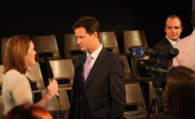 English: Nick Clegg at Cardiff University Students' Union conducting an interview with student media society CUTV. Captured on 19th April 2010.