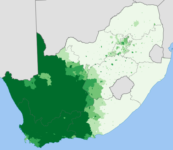 English: Map showing the proportion of the South African population that speaks Afrikaans at home, from the 2001 census broken down to "Main Place" level.   0–20%