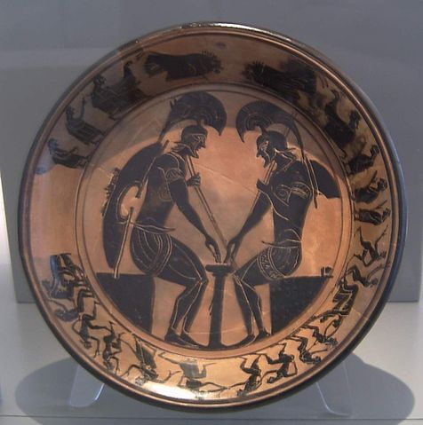 Deutsch: Zwei Krieger in Rüstung beim Brettspiel, schwarzfiguriger Teller, um 520 v. Chr., aus Olympia