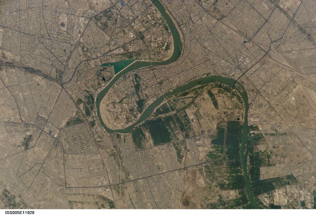 English: Astronaut Photo of Baghdad, Iraq taken from the International Space Station (ISS) during Expedition 5 on August 24, 2002.