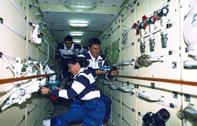English: Astronaut Nancy J. Currie and cosmonaut Sergei K. Krikalev, both mission specialists, use rechargeable power tools to manipulate nuts and bolts on the Russian-built Zarya module.