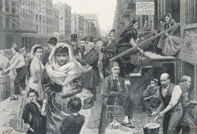 English: Everyday Activities of Syrian People Original caption: The Foreign element in New York, the Syrian colony, Washington Street. Drawn by W. Bengough.