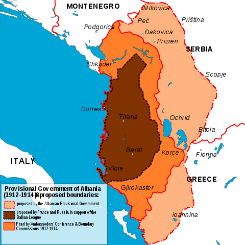 English: Proposed boundaries of the Principality of Albania: 1. By Russia, France in support of the Balkan League, 2. Fixed by Ambassadors Conference and Boundary Commission 1912-1914, 3. By the Prvisional Government of Albania.