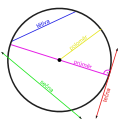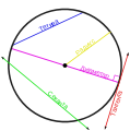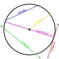 A  circle showing the chord, segment, radius, diameter and tangent.