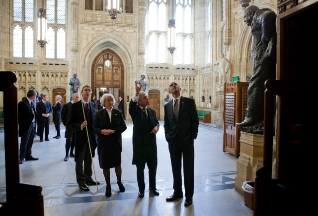English: The  Marquess of Cholmondeley, the  Lord Great Chamberlain,  Baroness Hayman, the  Lord Speaker,  John Bercow, the  Speaker of the House of Commons, and  Barack Obama, the  President of the United States, in the  Members' Lobby during a tour of the  Palace of Westminster prior to the President's speech to the  Parliament of the United Kingdom on 25 May 2011.