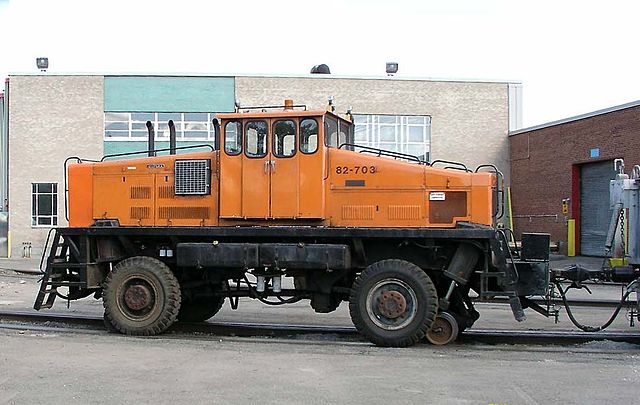 Old «Duplex» tractor used for the traction of heavy work trains in the Montréal Métro system. Traction is done through the rubber-tyred wheels and guidance is done by the retractable flanged wheels. They are capable of being operated on the street.