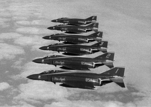 McDonnell Douglas F-4J Phantom II fighters of the U.S. Navy Blue Angels flight demonstration team fly cross-country between show sites in a line abreast formation in 1970 or 1971. |