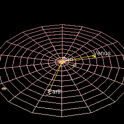 English: Venus orbits the Sun at an average distance of about 108 million kilometers (about 0.7 AU), and completes an orbit every 224.65 days. Venus is the second planet from the Sun and it revolves round the Sun approximately 1.6 times (yellow trail) in Earth's 365 days (blue trail)  http://weelookang.blogspot.com/2011/06/ejs-open-source-kepler-3rd-law-system.html |