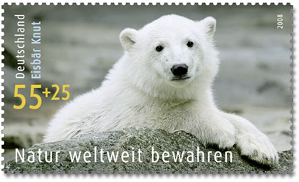 Türkçe: 2008'de Almanya'da kullanılan üzerinde meşhur kutup ayısı Knut'un 1 yaşındaki resmi bulunan pul. Üzerinde Almanca "Dünya çapında doğayı koru" yazıyor.