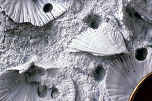 Description Trypanites borings in an Upper Ordovician hardground, southeastern Indiana.