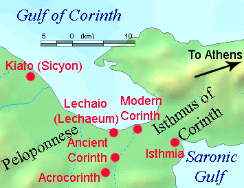 Map of area around ancient Lecaheum, near Corinth. The Corinthian Canal has been erased from the map.
