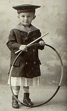 Junge mit  Reifen (Spielzeug), um 1902-1905. Der 1900 geborene Georg Victor Praefcke, Sohn eines aus Mecklenburg stammenden königlich preußischen Offiziers, fotografiert in  Straßburg im Elsass, trägt einen Kinder-Paletot im Stil der populären  Matrosenanzüge. |
