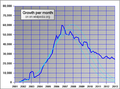 Article growth per month on en.wikipedia logistic model with extrapolation to 3, 3.5 and 4 million articles