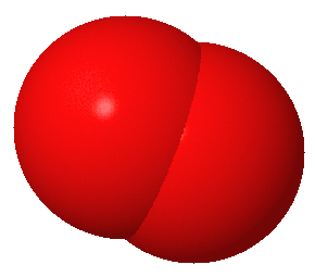 English: Space-filling model of the oxygen molecule (O2) created with Jmol ( http://chemapps.stolaf.edu/jmol/jmol.php?model=O2).