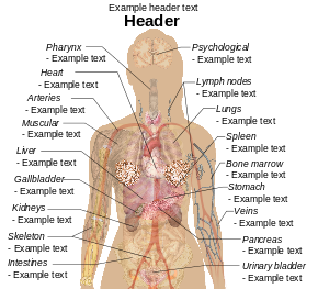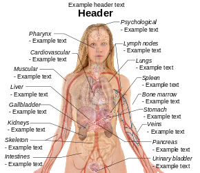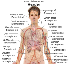 Human body diagramsMain article at: Human body diagrams Template location: Template:Human body diagrams How to derive an imageDerive directly from raster image with organsThe raster (.png format) images below have most commonly used organs already included, and text and lines can be added in almost any graphics editor. This is the easiest method, but does not leave any room for customizing what organs are shown.