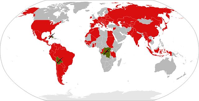 English: A world map displaying those countries lived in or visited by the revolutionary Che Guevara in red. Also included are the three nations where he engaged in armed revolution, signified in green.