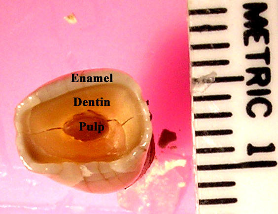 The effects of bruxism on an anterior tooth, labeled