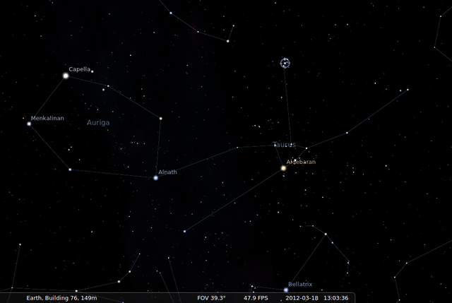 English: This is a screenshot, taken from the FOSS program Stellarium, showing the location of the Pleiades star cluster on the constellation Taurus.