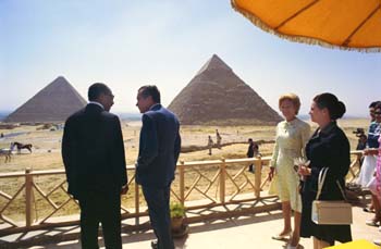 English: Presidents Sadat of Egypt and Nixon of the United States confer as their wives look on.